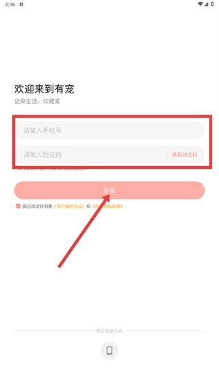 2、在登录页,填写手机号与获取的验证码,勾选协议后点击【登录-按钮】。