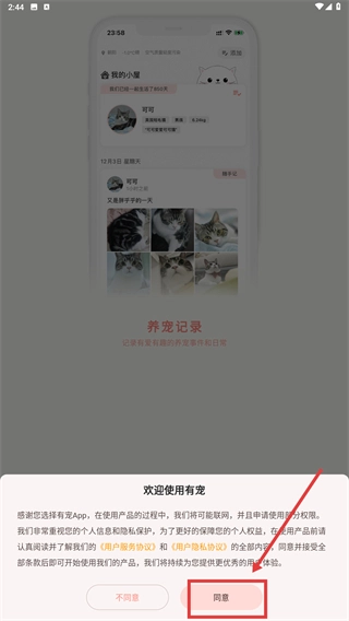 1、仔细阅读《用户服务协议》与《用户隐私协议》后,点击【同意】按钮即可进入应用。
