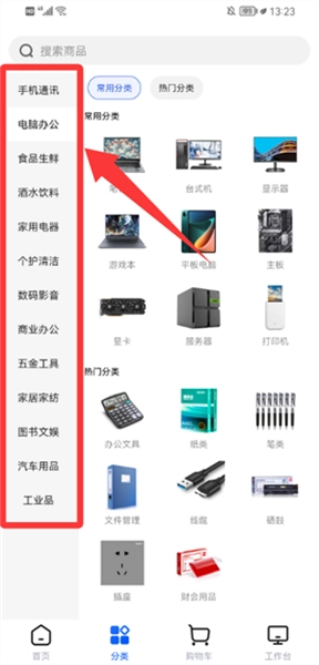 1、在分类页面选择商业办公大类,进入办公文具分类。