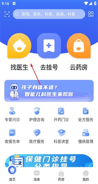 打开软件后,首页配备了找医生、去挂号、云药房等功能按钮,点击“找医生”选项,即可进入对应的功能页面。