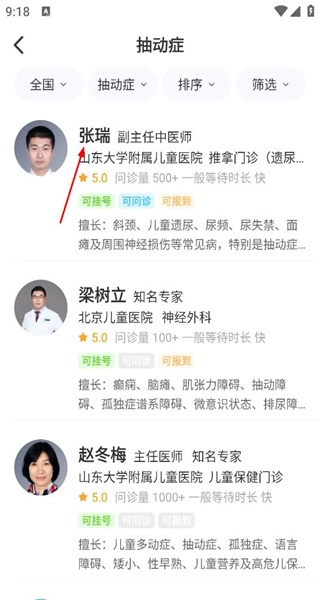 4、按疾病分类选择抽动症选项,进入抽动症对应的医生列表,查看医生职称科室及擅长病症信息。