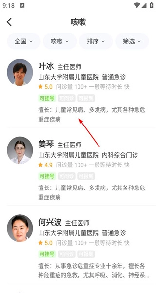 3、咳嗽医生列表呈现医生职称所属医院,查看医生擅长领域及服务状态,了解医生详细信息。