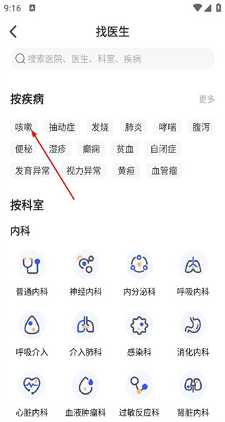 2、页面包含按疾病和按科室分类,点击咳嗽这一疾病选项,进入咳嗽对应的医生列表页面。