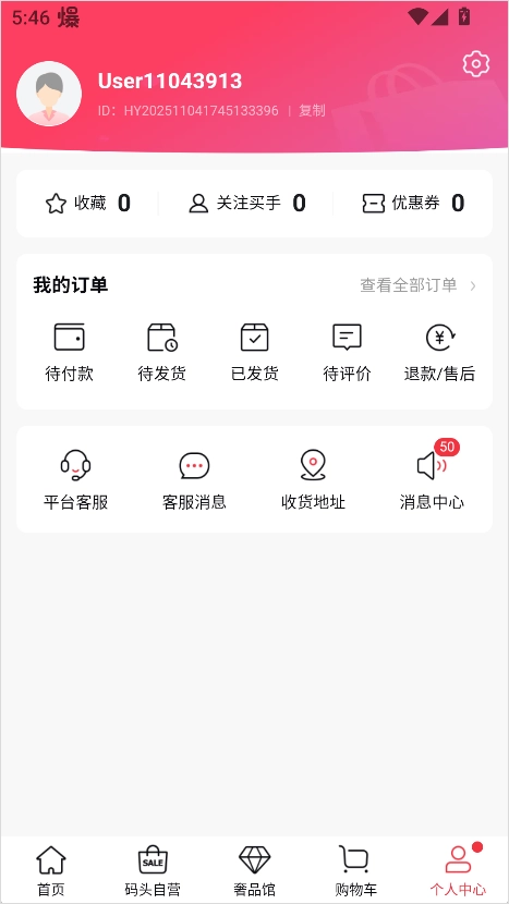 汇总了订单信息、优惠券、积分、客服入口及地址管理等功能。