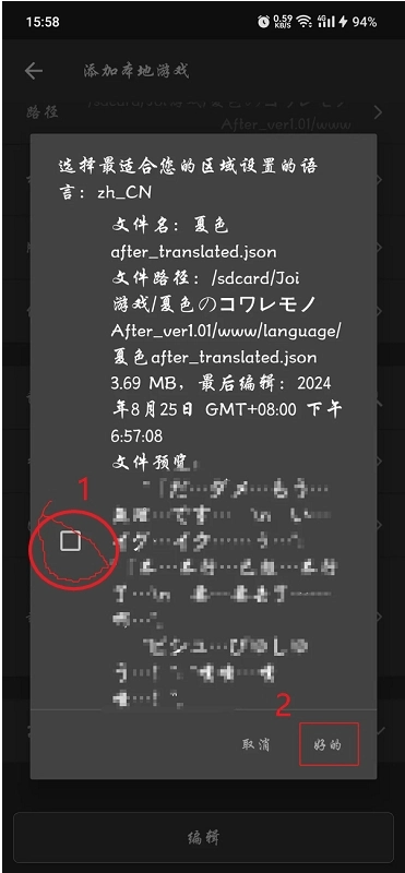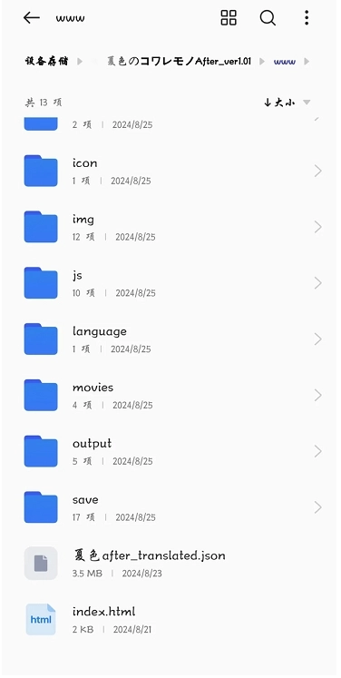 3.添加完游戏其实就可以直接启动了,但这个时候启动还没有添加翻译文件,所以启动游戏的话也是没有汉化的。想要加载翻译文件,首先需要打开文件管理器(手机自带的获取其他的文件管理器都行)。找到游戏文件夹,然后找到后缀为JSON的文件。(像夏色泡影我是直接建了一个翻译文件的文件夹,但是有时候不是每个游戏都建了这个文件夹。这个时候就需要自行在游戏文件夹里寻找后缀为JSON的游戏。)