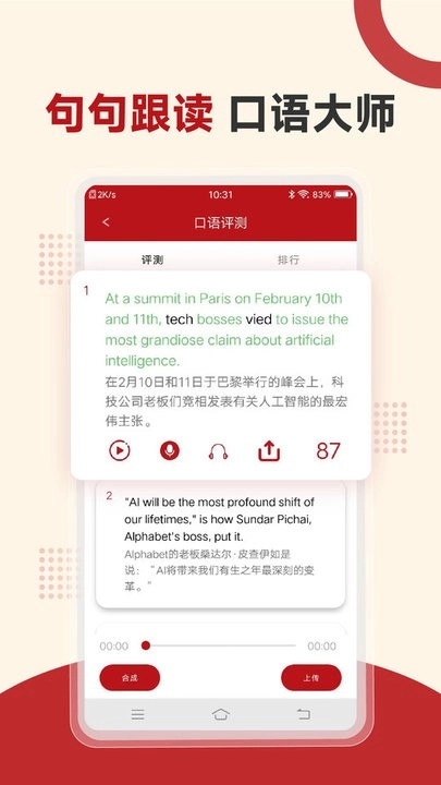 3. 语音评测,口语训练。为每天文章提供语音与原文同步,每句跟读训练,AI技术助您学习英语练习英语口语。