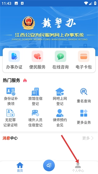 1、打开【赣警办】首页后,点击底部的【个人中心】按钮,此页面具备公安政务服务功能,能够进入账号登录的相关界面。