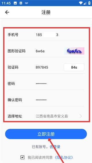 3、在注册页填写手机号、图形验证码、短信验证码、密码,选地址后勾选相关协议。