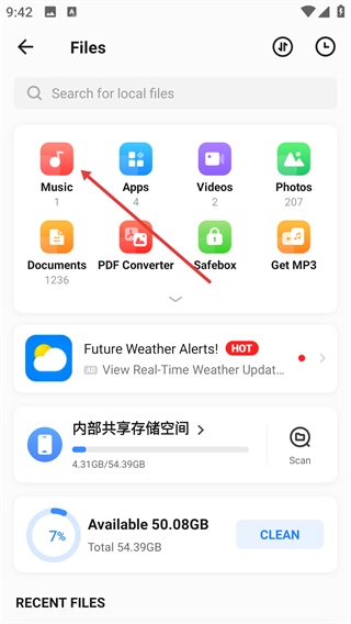 2、进入【Files】页面后,选择【Music】分类,可查看本地音乐文件的存储情况。