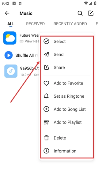 4、在弹出的操作菜单中,可选择【Select】-【Send】等选项,对该音乐文件进行对应操作。