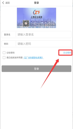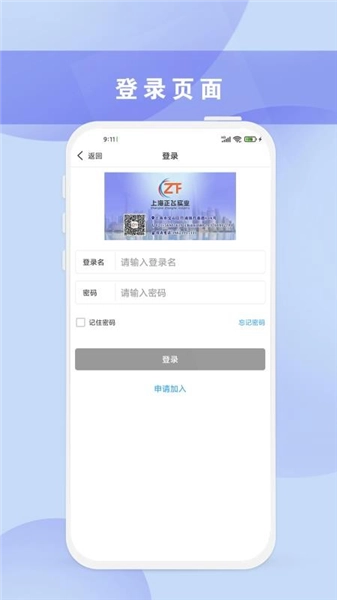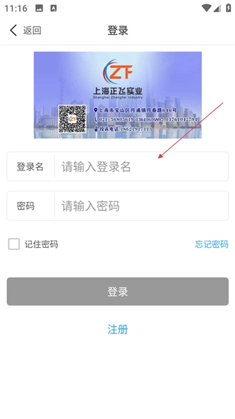 2、进入登录页,要填登录名、密码,也能注册、新账号,还可扫码联系上海正飞实业。