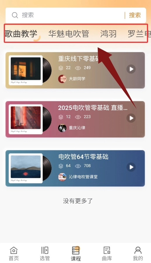 4、课程界面包含歌曲教学、品牌专题与华魅、鸿羽等系列课程。