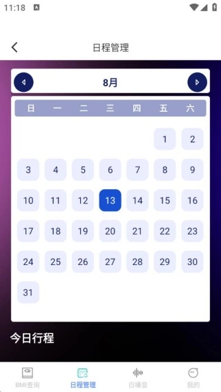 2. 通过日历的形式展示BMI打卡状况以及每日行程,使用户能够更便捷地追踪健康数据并规划日常安排。