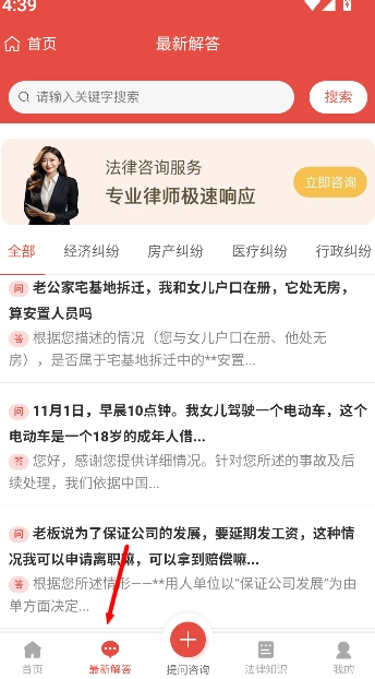 1、打开《法律咨询问答》,进入首页后查看页面布局,掌握快速发起法律咨询的方法。