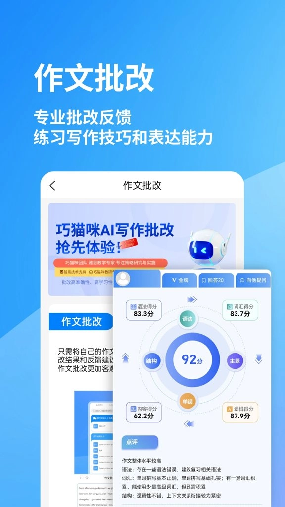 提交作文后,由外教标注修改建议并返回文本。专业教师会从语法结构、词汇运用、逻辑连贯性等多个维度进行批改。每篇作文都会获得详细的评分报告和改进建议,帮助用户逐步提升写作水平。系统还会自动保存历史作文,方便追踪进步轨迹。