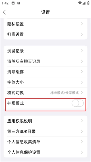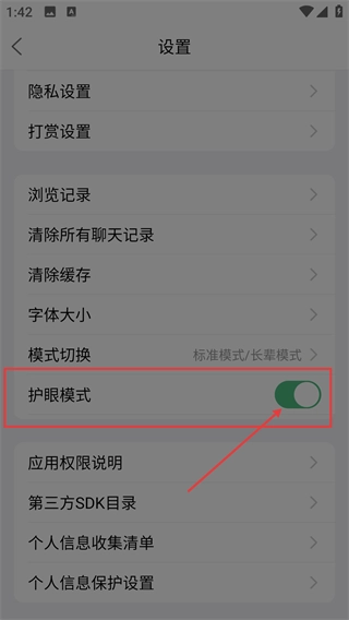 4、点击【护眼模式】的开关按钮,将其切换为开启状态,应用界面会切换为更柔和的显示模式。