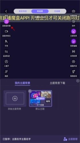 2、直播魔盒的素材中心海量精品背景,您可随意挑选使用,点击①主题按钮,选择②自定义主题选项,再点击③添加主题,进入到主题添加页点击④添加背景按钮从下面弹窗的⑤素材中心、相册中添加图片或视频背景。