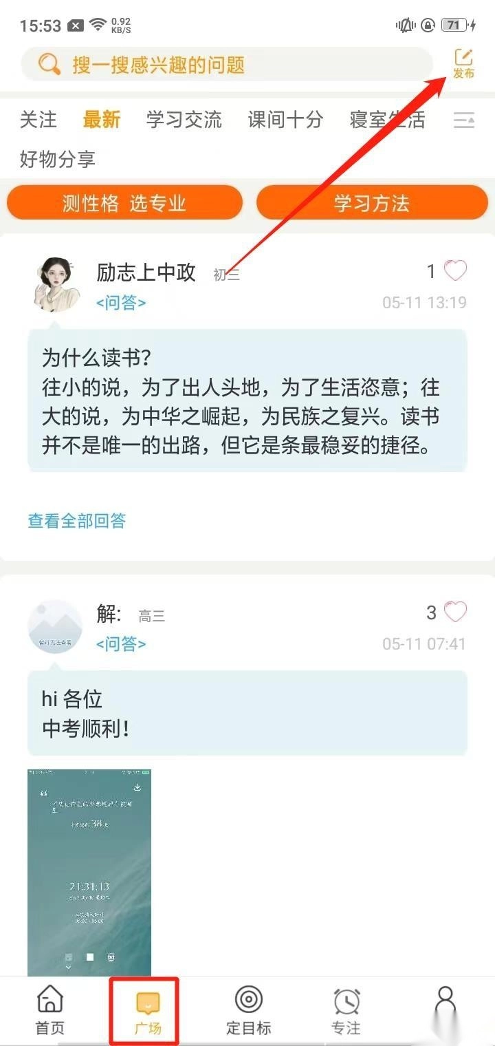 4、用户可以在广场上发布自己信息,点击下方功能栏的【广场】,然后再点击上方的【发布】,就可以输入自己想要发布的信息内容;
