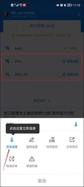 2、从例图中可以看到,名称后面带有钥匙图标的就是可自动连接的热点,我们只需点击“安全连接”按钮,就能自动完成WiFi的连接操作。