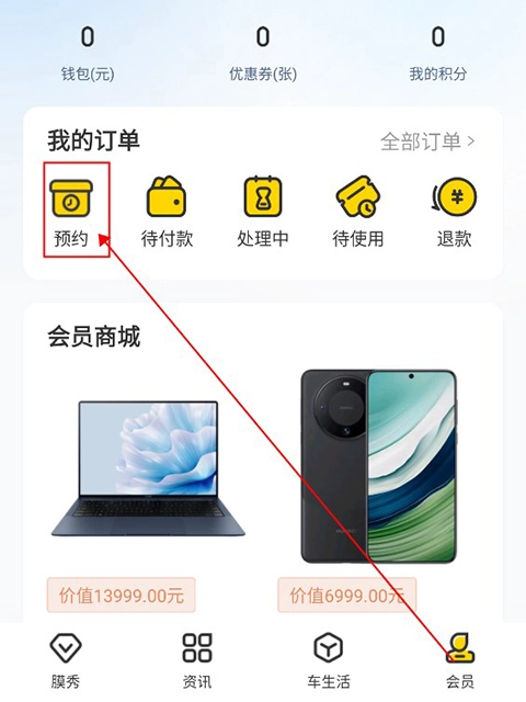 支付完成之后,用户可以返回首页点击右下角“会员”,再点击上方的“预约”就可以查看订单啦。