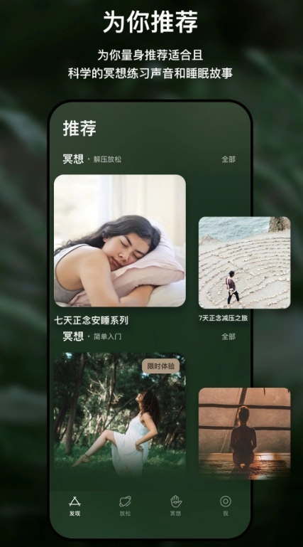 1、为用户推荐每日冥想练习,10 分钟,让自己喘口气,重新迎接生活