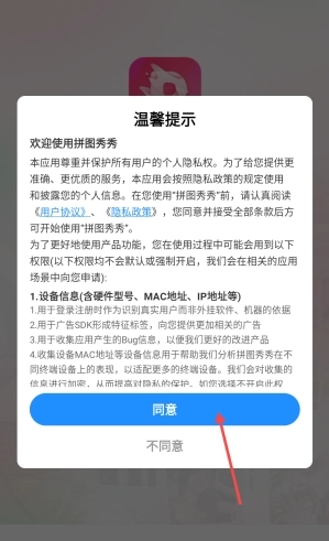 1. 开启软件后,依照页面提示点击【同意】,从而进入下一界面。