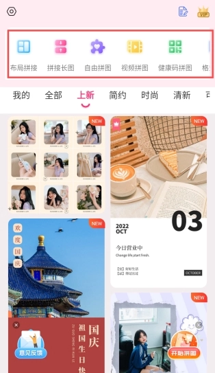 3、应用界面简单清晰,支持自由拼图、长图、线拼接、无缝拼图、AI消去