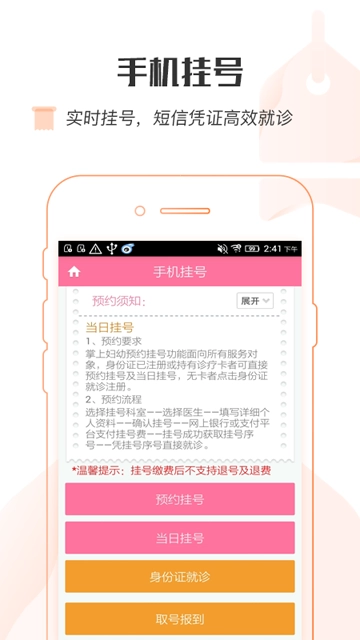 1、可随时随地通过应用轻松挂号三甲医院,并且就医费用可通过在线支付,省去排队时间。