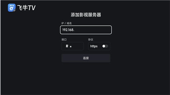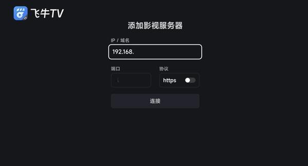 可手动 添加服务器,需要输入飞牛影视服务器的 IP 地址,如果有配置 DDNS 域名,也可以直接输入域名以连接。