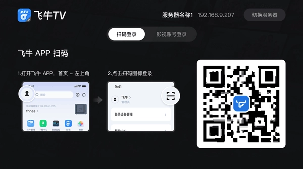 成功连接到飞牛影视服务器后,需要登录影视账号,你可以选择以下 2 种方式以登录影视账号: