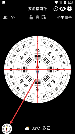 2、在【罗盘指南针-界面】中,点击左下角的小罗盘图标,即可进入罗盘样式选择页面。