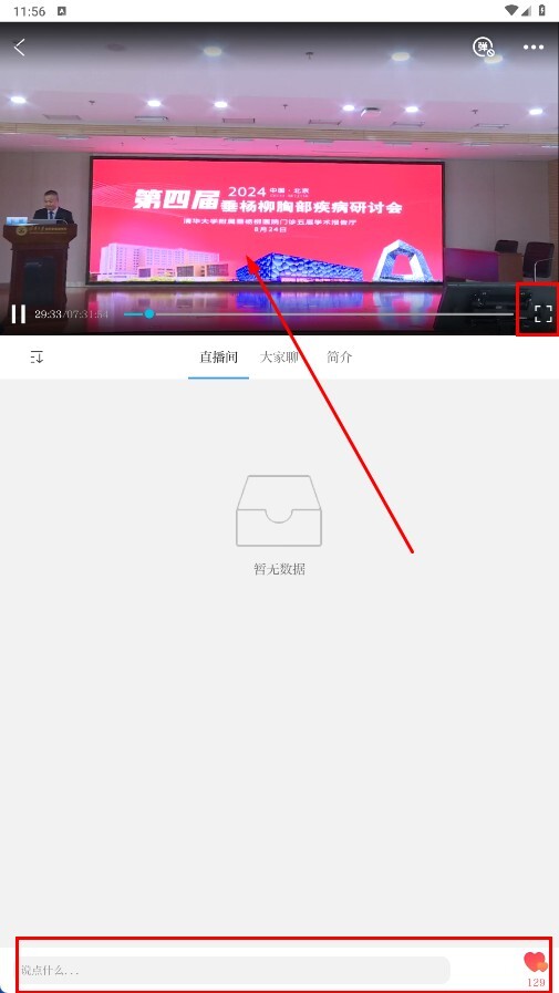 4、进入直播播放页,可观看研讨会直播,还可点击全屏按钮或参与互动评论。