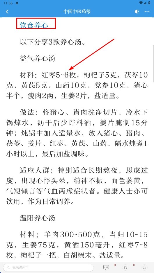 2、进入文章详情页面后,能够查看【饮食养心-文章主题】板块下的养生汤相关介绍,例如益气养心汤的食材、制作步骤等内容。