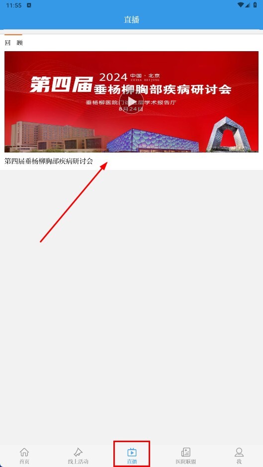 3、点击底部的【直播】功能按钮,进入直播页面后,选择【第四届垂杨柳胸部疾病研讨会】的直播内容。