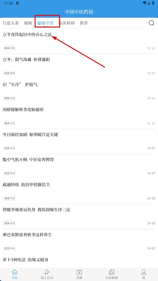 1、点击【健康中国-分类标签】,查看相关健康养生文章,例如《立冬饮食起居中的养心之法》。