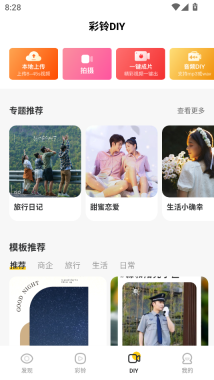 1、打开联通视频彩铃应用,点击底部的【DIY】选项,进入彩铃DIY页面,这里有多种制作方式和模板可供选择,开启自制彩铃的第一步吧。