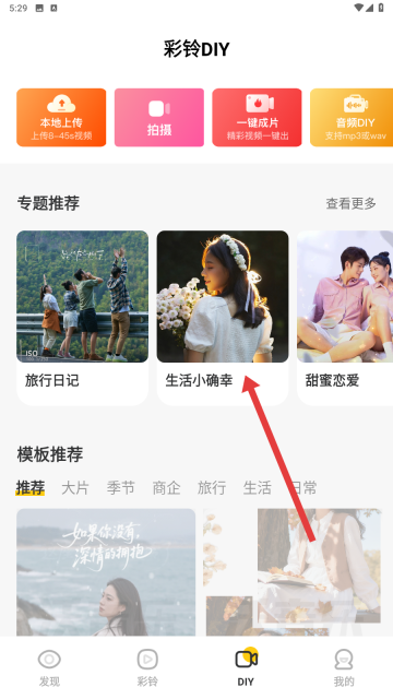 2、进入彩铃DIY页面后,在专题推荐板块中找到【生活小确幸】模板并点击进入,这就离打造专属彩铃更近一步啦。