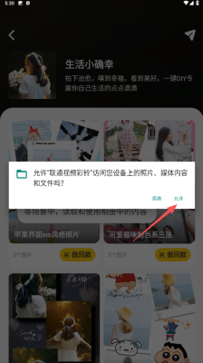 3、进入模板后,若弹出权限请求,请点击【允许】,以便应用能够访问设备中的照片、媒体内容和文件,这是为制作彩铃准备素材的必要步骤哦。