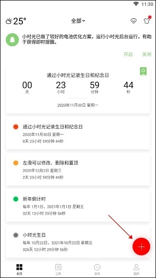 1、完成引导操作后,点击屏幕下方的“+”按钮即可开始创建重要的纪念日事件,这些事件可以涵盖生日、爱情纪念日、节日、旅行、工作等多种类型。