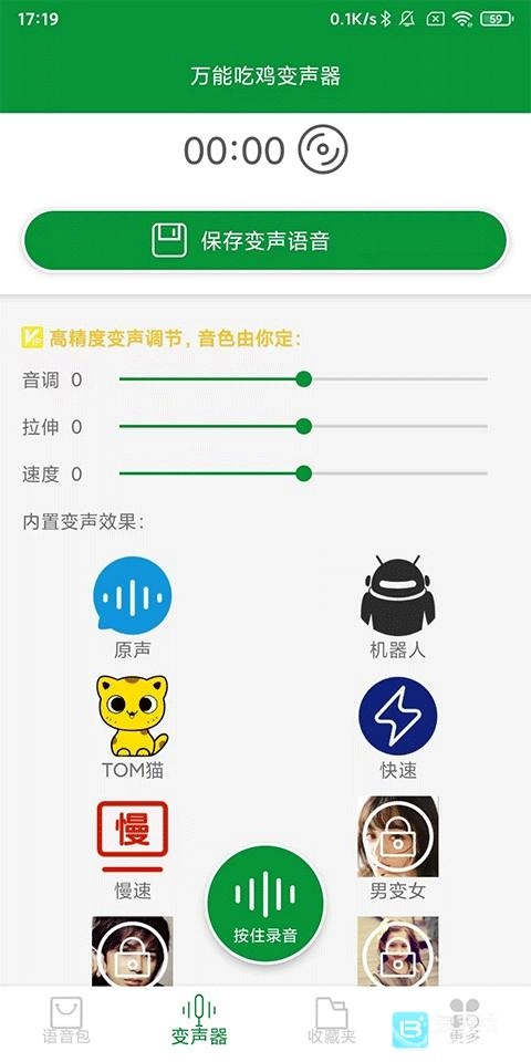 3、点击变声器-按住录音-选择变声效果-保存变声语音;