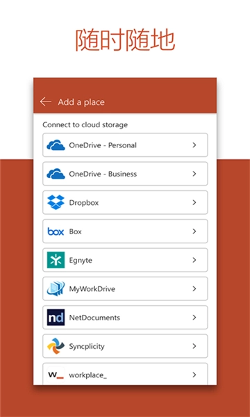 使用 PowerPoint 应用,可访问自己熟知的幻灯片制作工具。随时随地快速轻松地创建、编辑、查看、演示或共享演示文稿。