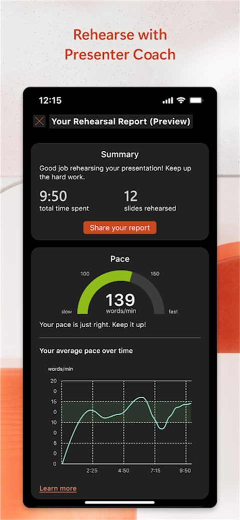 利用“演示者指导”工具变身演示文稿达人,这是一款新的 AI 工具,旨在为使用者进行公开演讲提供支持。进行演示练习,获取实时建议,调整语速,避免“嗯...”等感觉犹豫的语气词,自信地说话。需要使用处于活动状态的 Microsoft 365 订阅。