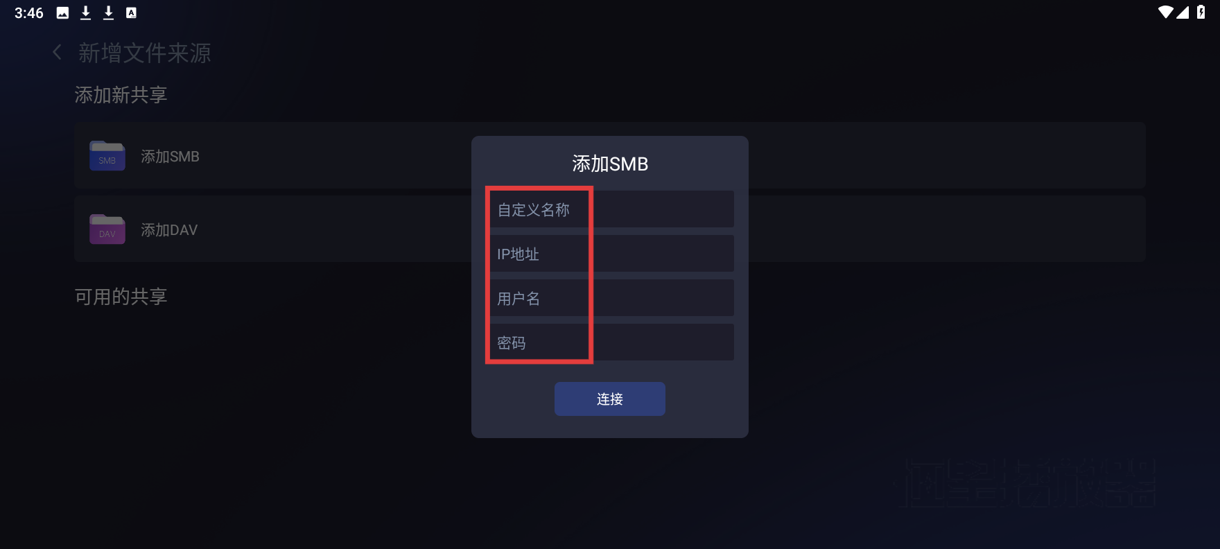 4、在添加SMB的弹窗里,依次填入自定义名称、IP地址、用户名和密码,随后点击【连接】按钮,即可完成SMB的添加操作。