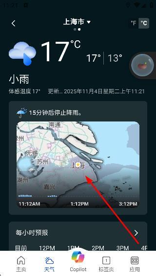4、选定城市后,就能查看该城市的天气详情,像上海市的温度、天气状况、逐小时预报等信息,从而掌握该城市的天气情况。