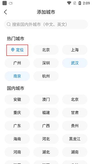 3、进入页面后,可以选择直接定位自身所在城市,也可以手动添加。