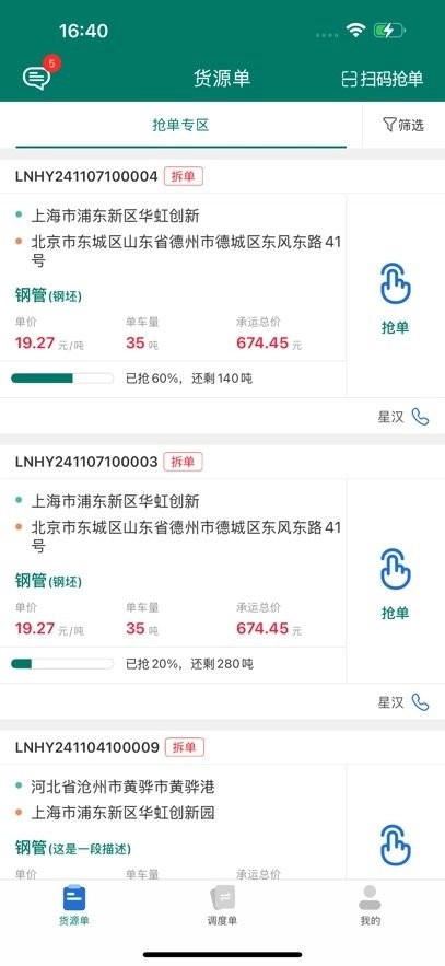 抢单:发布货源时,托运人填写运价,承运人通过平台看到运单运费价格 ,并进行选择成交的操作。