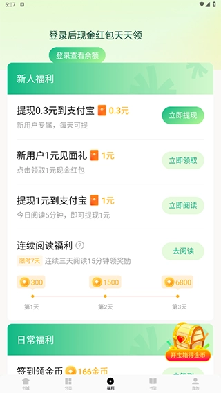 签到福利,金币福利,阅读福利……各种福利应有尽有,随时提现,只要你每天常来读!