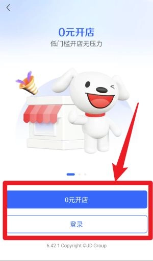 2、在欢迎页面,用户可选择0元开店按钮快速注册新店铺,或通过下方登录入口使用已有京东账号直接进入系统,方便不同身份的商家操作。