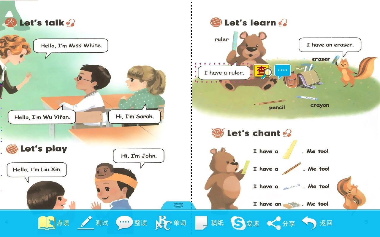 具备课文点读功能,点击相应发音区域,即可实现中英文交替发声,无论是句子、单词还是人物对话,都能进行点读操作。