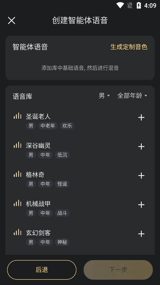9、在这里就可以创建智能体的语言了,完成之后点击“下一步”。
